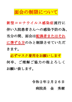 新型コロナウイルスの感染症流行に伴い、入院患者さんへの感染予防のため、当分の間、面会は配偶者またはそれに準ずる方のみと制限させていただきます。