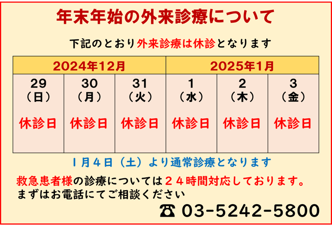 あさひ病院 · 2024/11/30 年末年始の外来診療について 年末年始の外来診療については下記のとおりです。 年末は12月28日(土)まで通常診療となります。 年始は1月4日(土)より通常診療となります。 救急患者様の診療については24時間対応しております。まずはお電話にてご相談ください。 ☎ 03-5242-5800 よろしくお願いいたします。 令和6年11月30日 あさひ病院 tagPlaceholderカテゴリ: コメントをお書きください コメント: 0