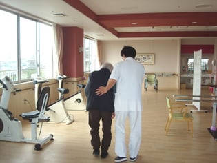 当施設のリハビリテーション科は、常勤の理学療法士(PT)が5名、言語聴覚士(ST)が1名、非常勤の作業療法士(OT)が2名在籍しており、各専門家が個別的にリハビリテーションを行っております。様々な事象により当施設へ入所されている方に向けて在宅復帰を希望される方には、ご自宅での生活を見据えたプログラムを提案し、ご家族様への介護指導やご自宅の状況を確認して、それに基づいたプログラムの提供を積極的に行っています。また、施設内での生活状況を確認し、ご本人の心身面についても全職種で評価しながら、いろいろな角度から支援方法を検討しております。リハビリテーションでは個別担当制を導入しており、個々に合ったリハビリテーションを提供しています。